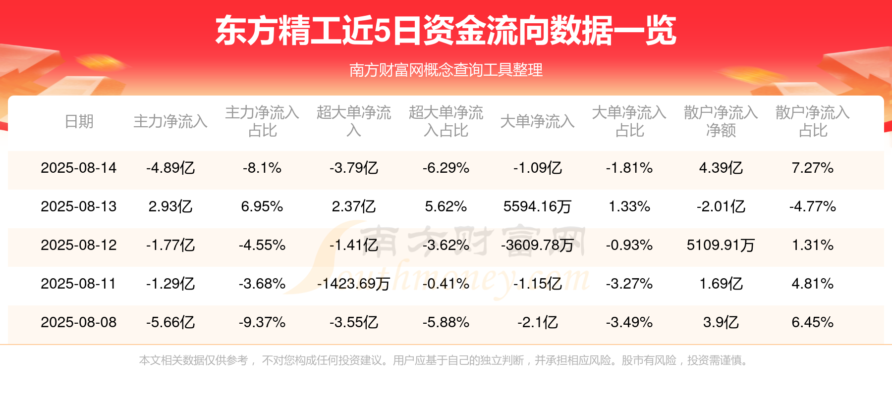 8月14日消息,东方精工资金净流出4.89亿元,超大单资金净流出3.79亿元,换手率30.72%,成交金额60.36亿元。