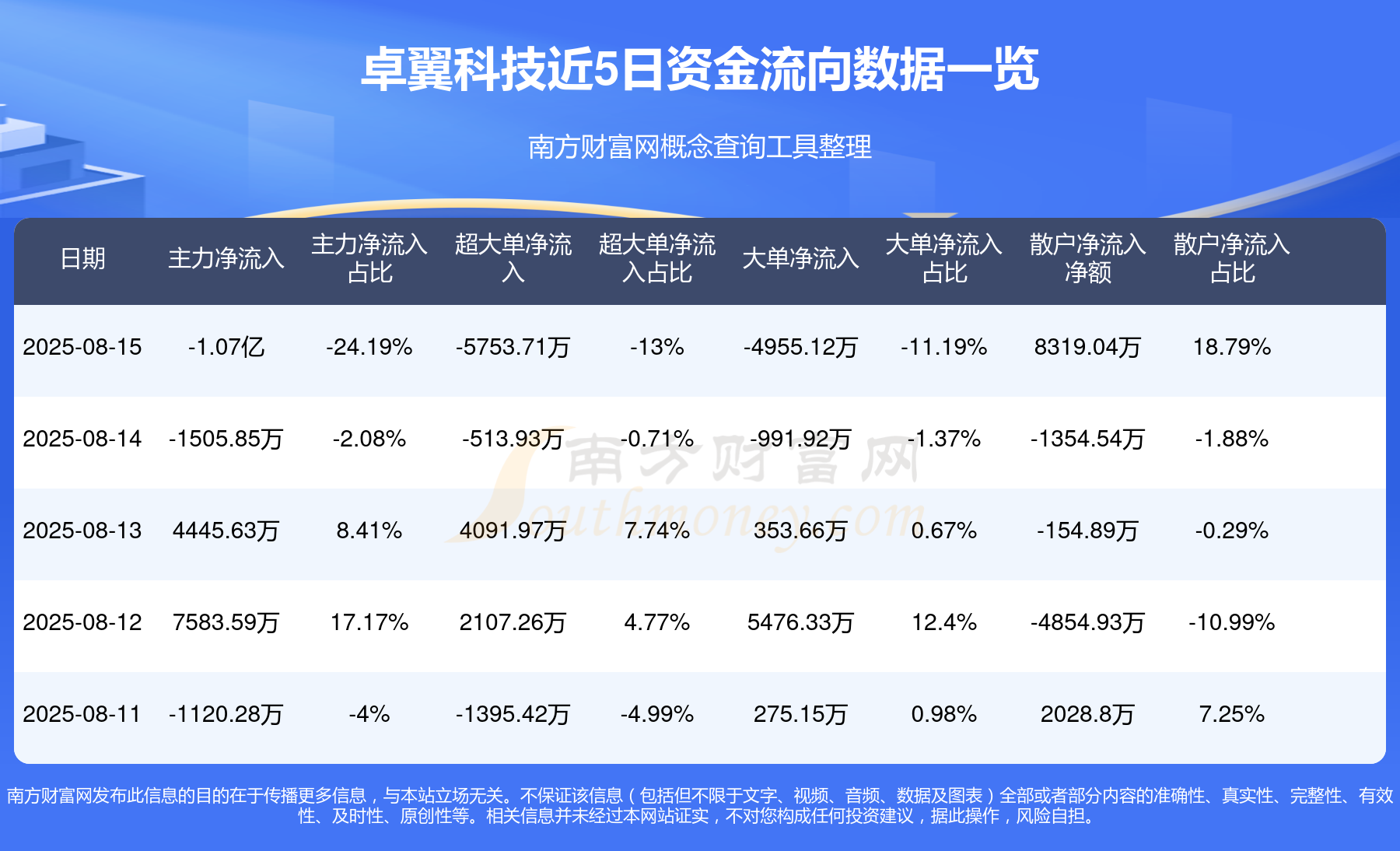 8月15日消息,卓翼科技8月15日主力净流出1.07亿元,超大单净流出5753.71万元,大单净流出4955.12万元,散户净流入8319.04万元。