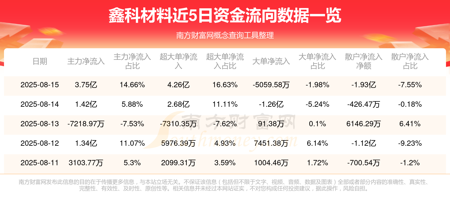 资金流向数据方面,8月15日主力资金净流流入3.75亿元,超大单资金净流入4.26亿元,大单资金净流出5059.58万元,散户资金净流出1.93亿元。