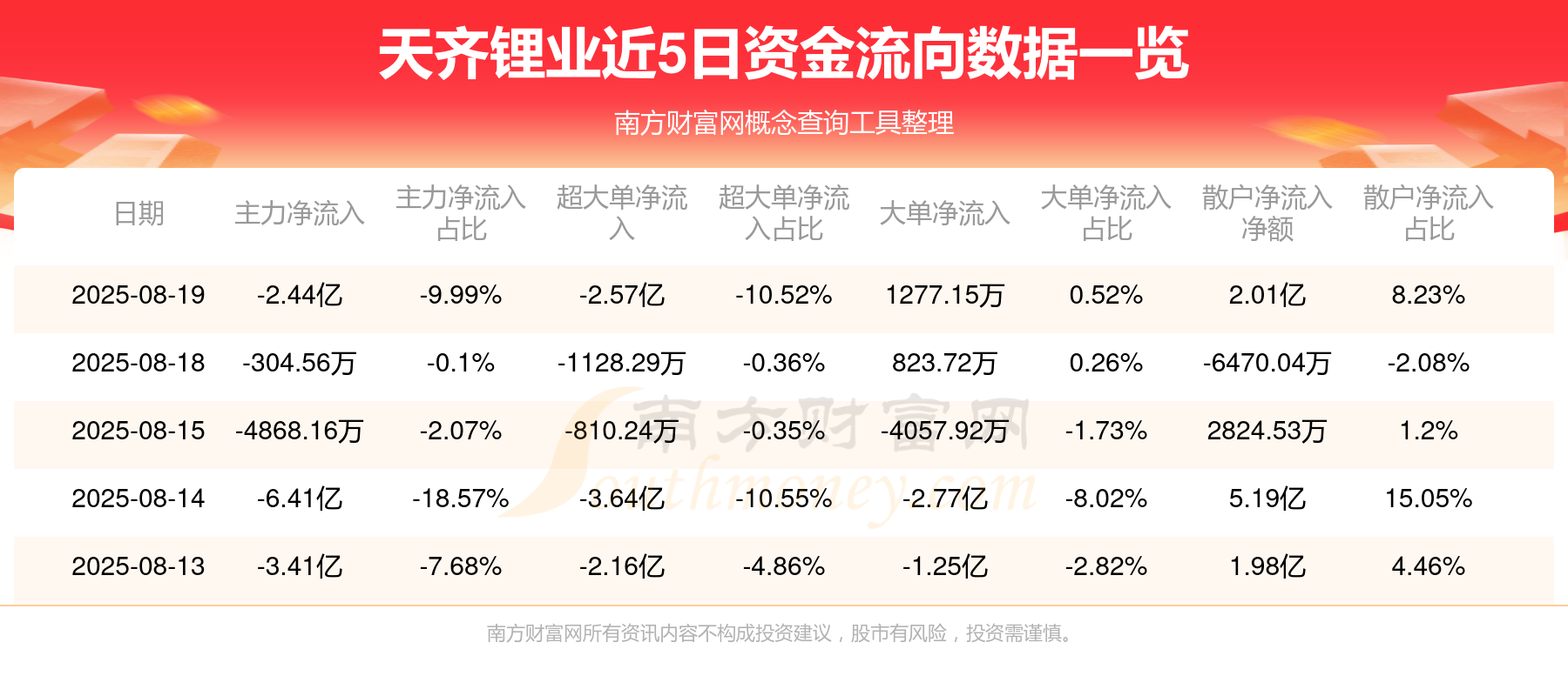 8月19日消息,天齐锂业8月19日主力资金净流出2.44亿元,超大单资金净流出2.57亿元,大单资金净流入1277.15万元,散户资金净流入2.01亿元。