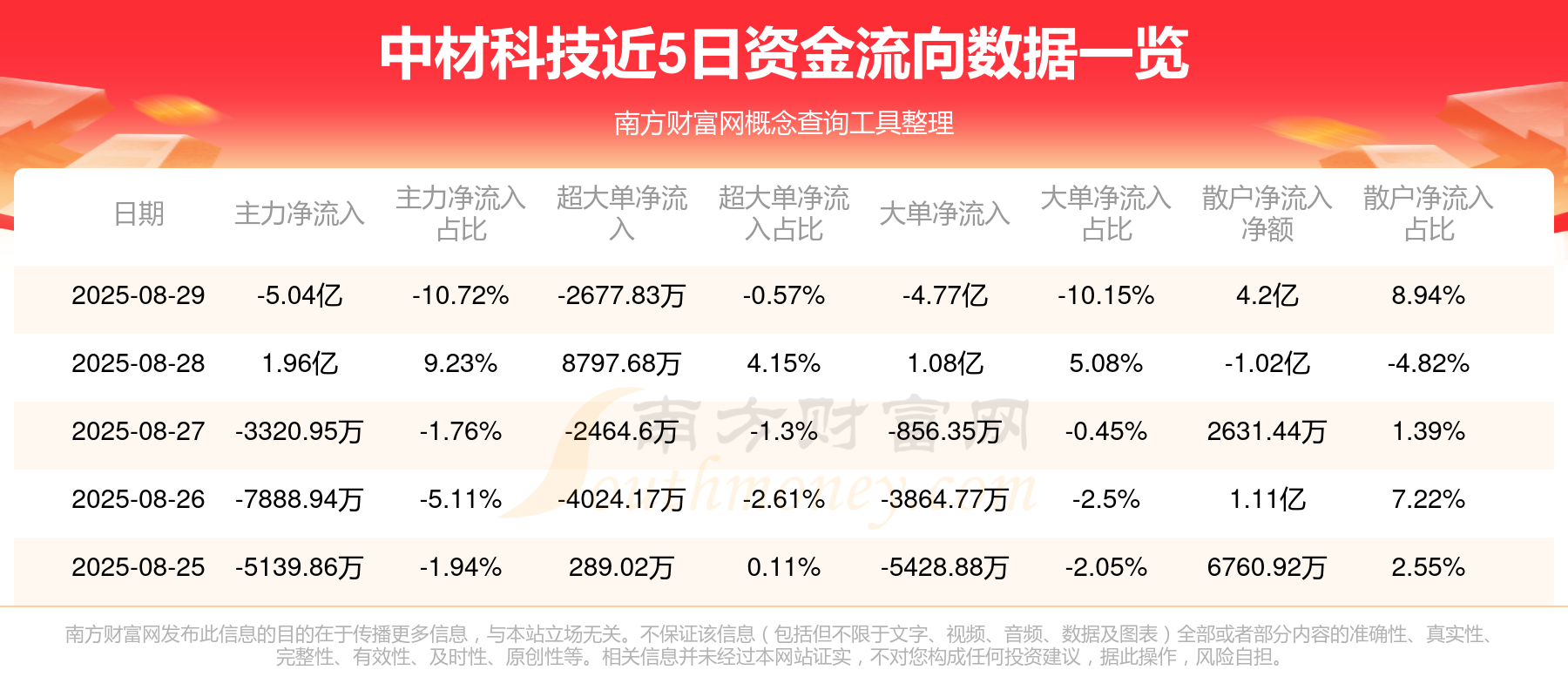 8月29日消息,中材科技主力净流出5.04亿元,超大单净流出2677.83万元,散户净流入4.2亿元。