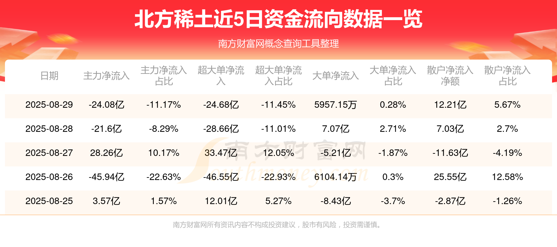 8月29日消息,北方稀土主力资金净流出24.08亿元,超大单资金净流出24.68亿元,散户资金净流入12.21亿元。