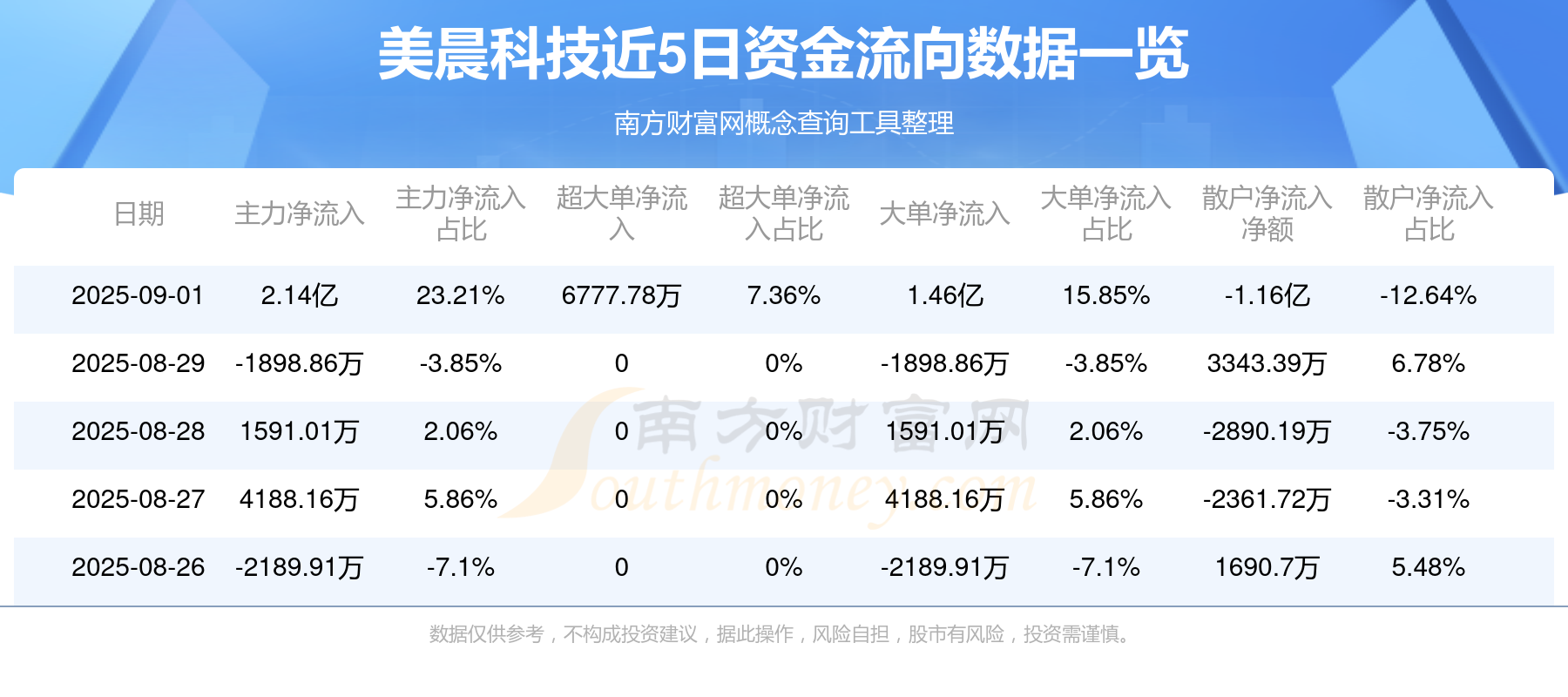 9月1日消息,美晨科技9月1日主力资金净流入2.14亿元,超大单资金净流入6777.78万元,大单资金净流入1.46亿元,散户资金净流出1.16亿元。