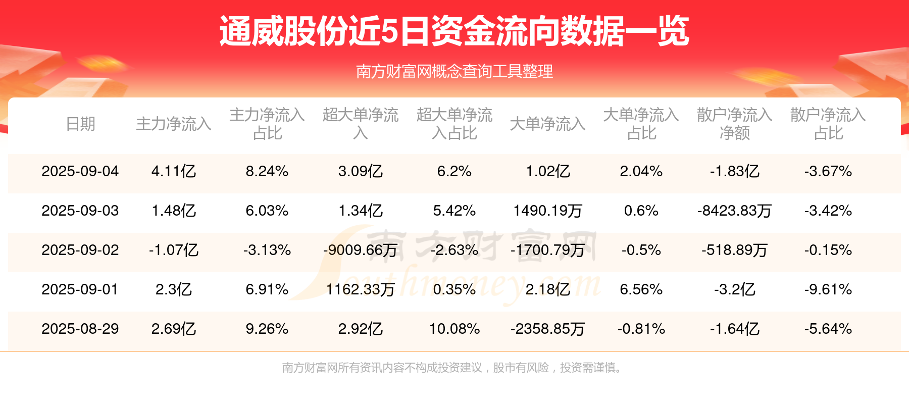9月4日该股主力净入4.11亿元,其中资金流入方面:超大单净入12.64亿元,大单净入14.39亿元,中单净入13.2亿元,散户净入9.17亿元;资金流出方面:超大单净出9.55亿元,大单净出13.37亿元,中单净出15.48亿元,散户净出11亿元。