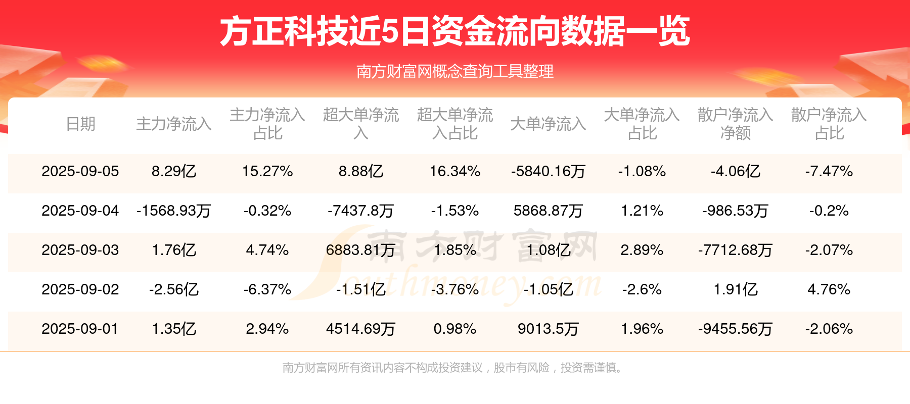 9月5日消息,方正科技资金净流入8.29亿元,超大单资金净流入8.88亿元,换手率14.03%,成交金额54.32亿元。