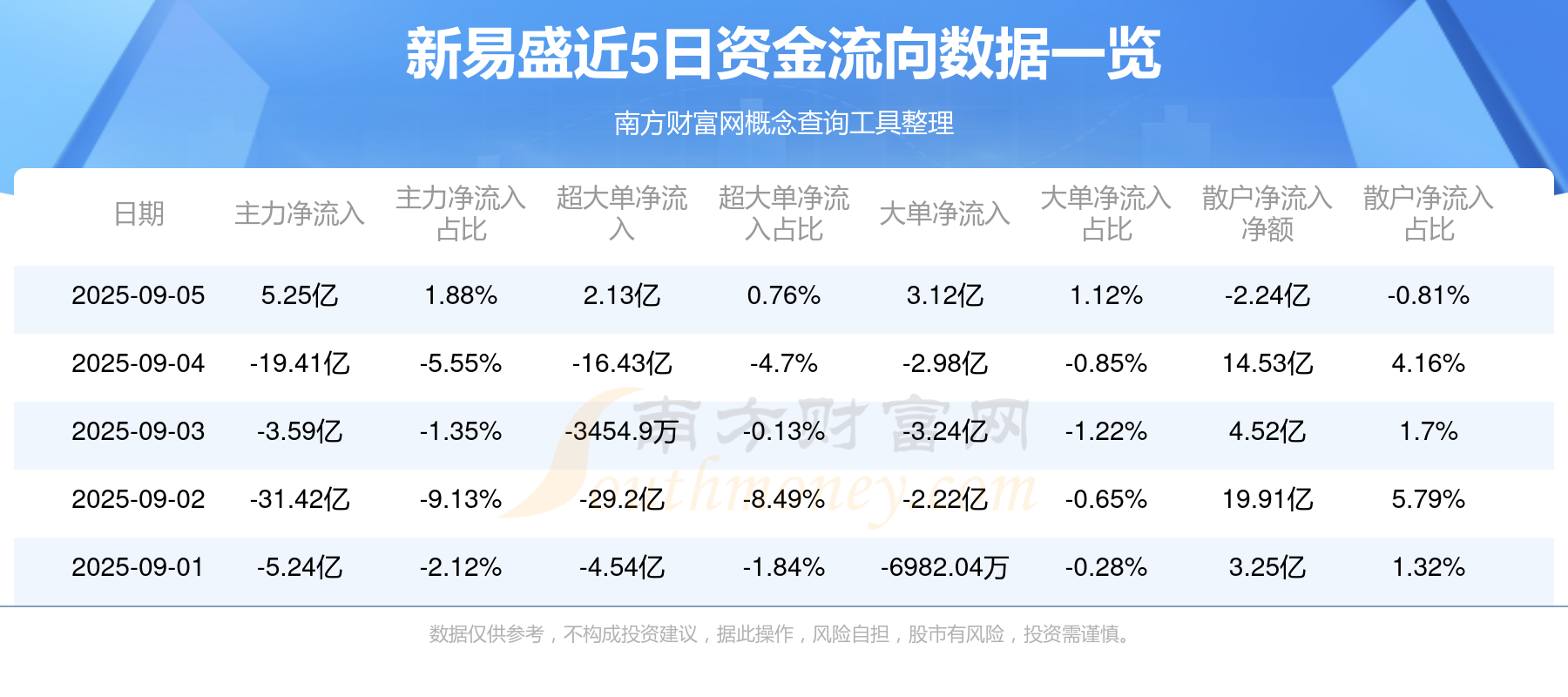 9月5日消息,新易盛9月5日主力资金净流入5.25亿元,超大单资金净流入2.13亿元,大单资金净流入3.12亿元,散户资金净流出2.24亿元。