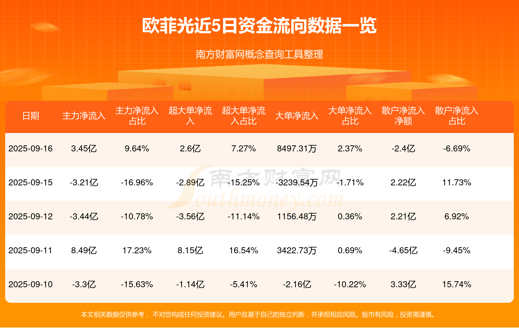 9月16日消息,欧菲光9月16日主力净流入3.45亿元,超大单净流入2.6亿元,大单净流入8497.31万元,散户净流出2.4亿元。
