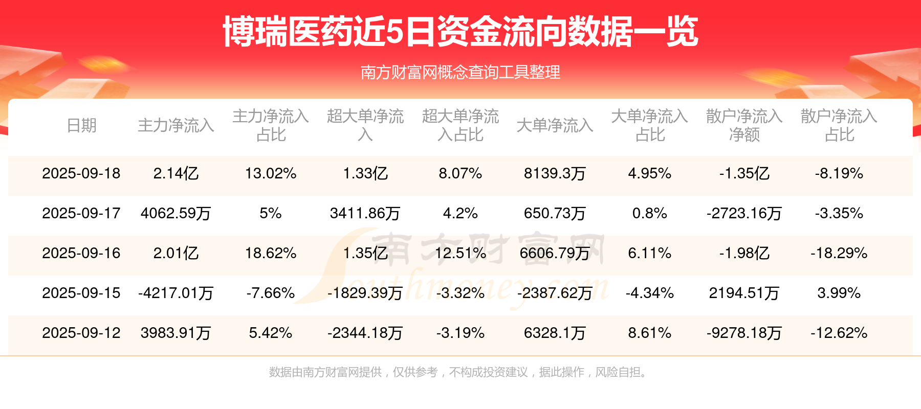 9月18日消息,博瑞医药9月18日主力净流入2.14亿元,超大单净流入1.33亿元,大单净流入8139.3万元,散户净流出1.35亿元。