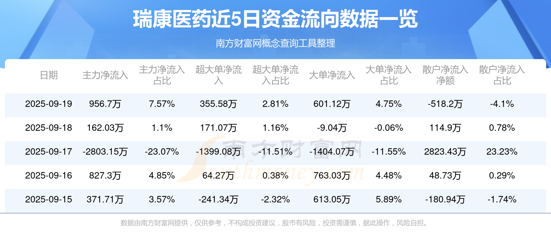 9月19日消息,瑞康医药9月19日主力净流入956.7万元,超大单净流入355.58万元,大单净流入601.12万元,散户净流出518.2万元。