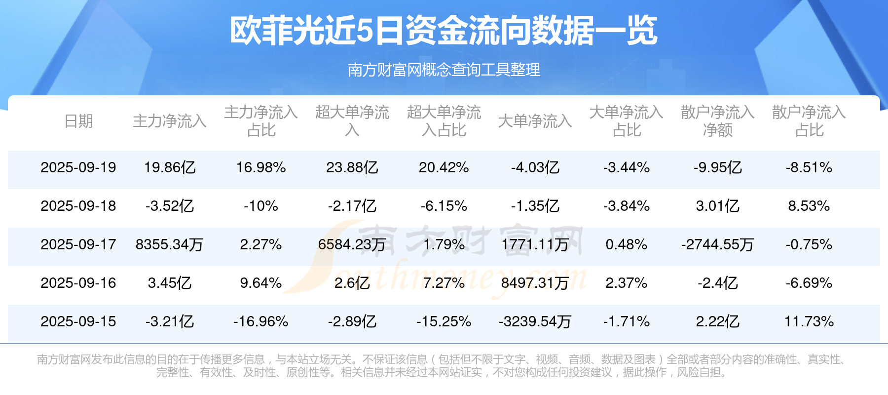 9月19日消息,欧菲光主力净流入19.86亿元,超大单净流入23.88亿元,散户净流出9.95亿元。