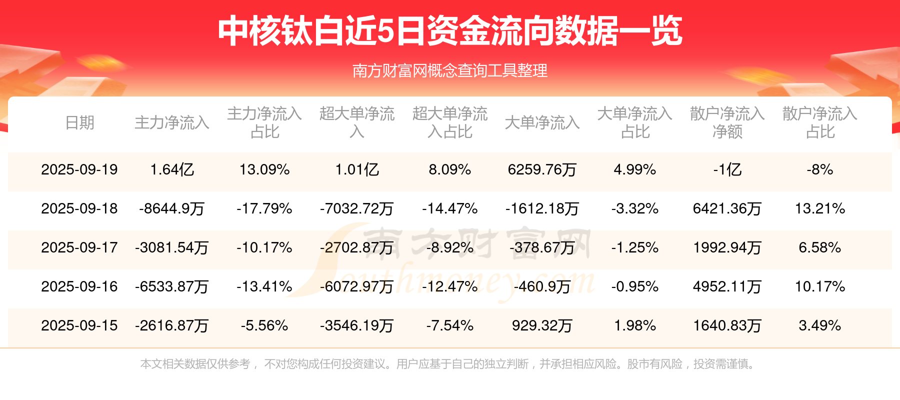 9月19日消息,中核钛白资金净流入1.64亿元,超大单资金净流入1.01亿元,换手率6.42%,成交金额12.54亿元。