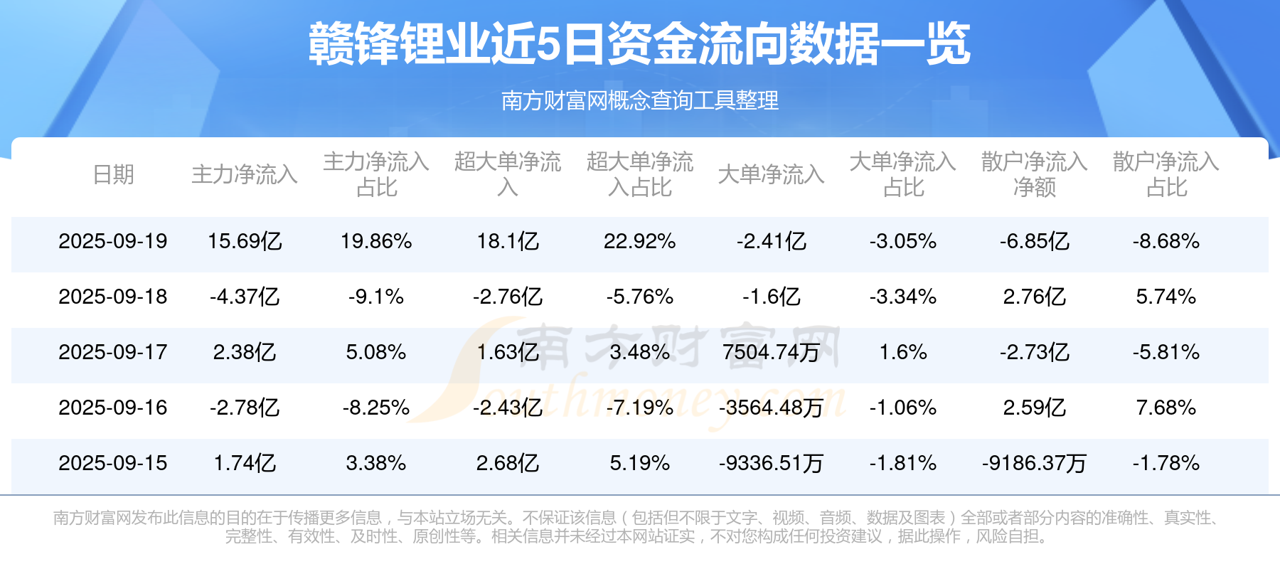 9月19日消息,赣锋锂业9月19日主力资金净流入15.69亿元,超大单资金净流入18.1亿元,大单资金净流出2.41亿元,散户资金净流出6.85亿元。