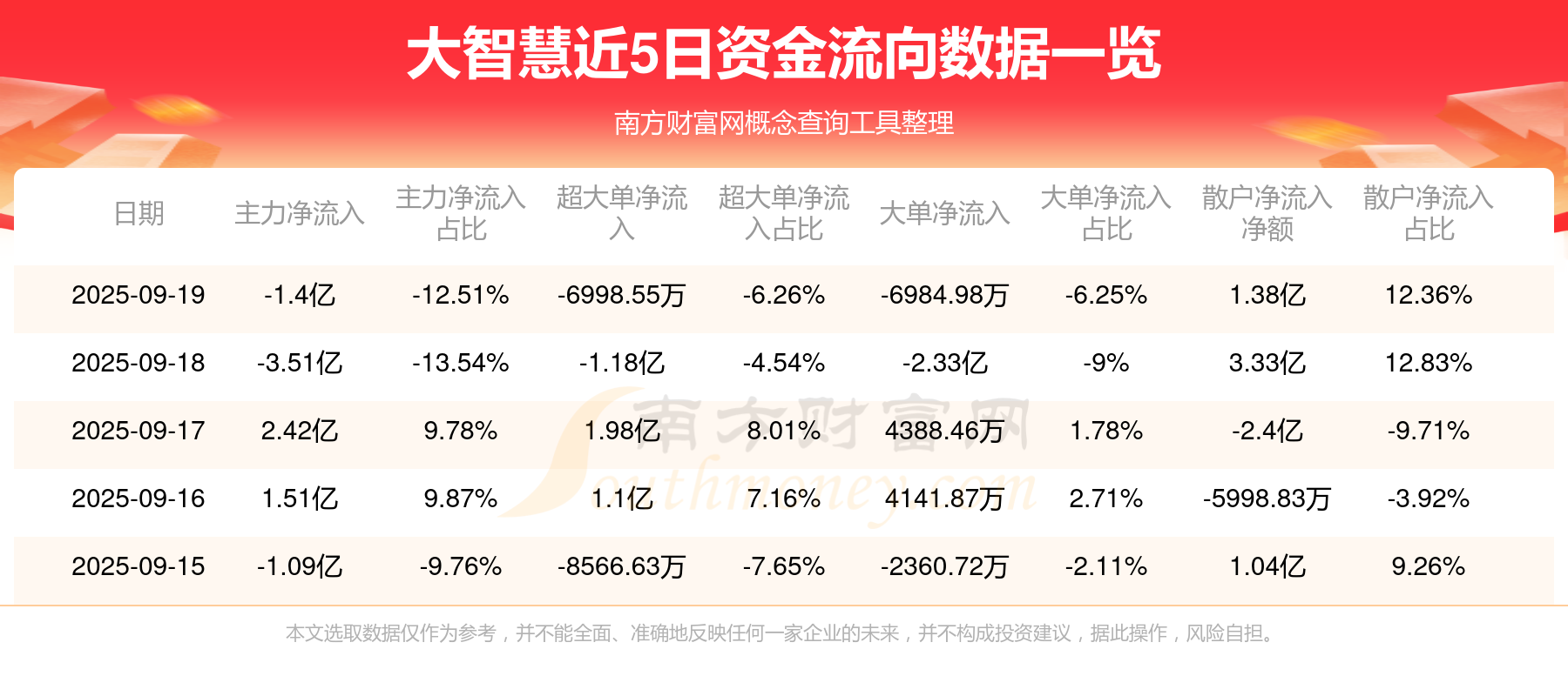 9月19日消息,大智慧资金净流出1.4亿元,超大单净流出6998.55万元,换手率3.7%,成交金额11.18亿元。