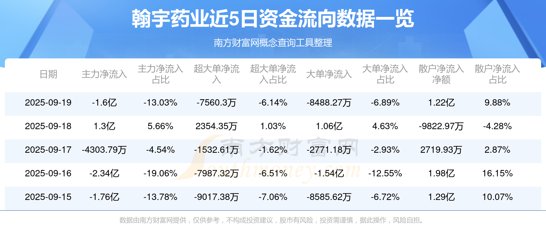 【9月19日】今日翰宇药业(300199)主力净流入净额-1.6亿元,占比-13.03%。该股开盘报24.82元,收于24.140元,跌2.74%,总市值为213.21亿元,换手率6.76%。
