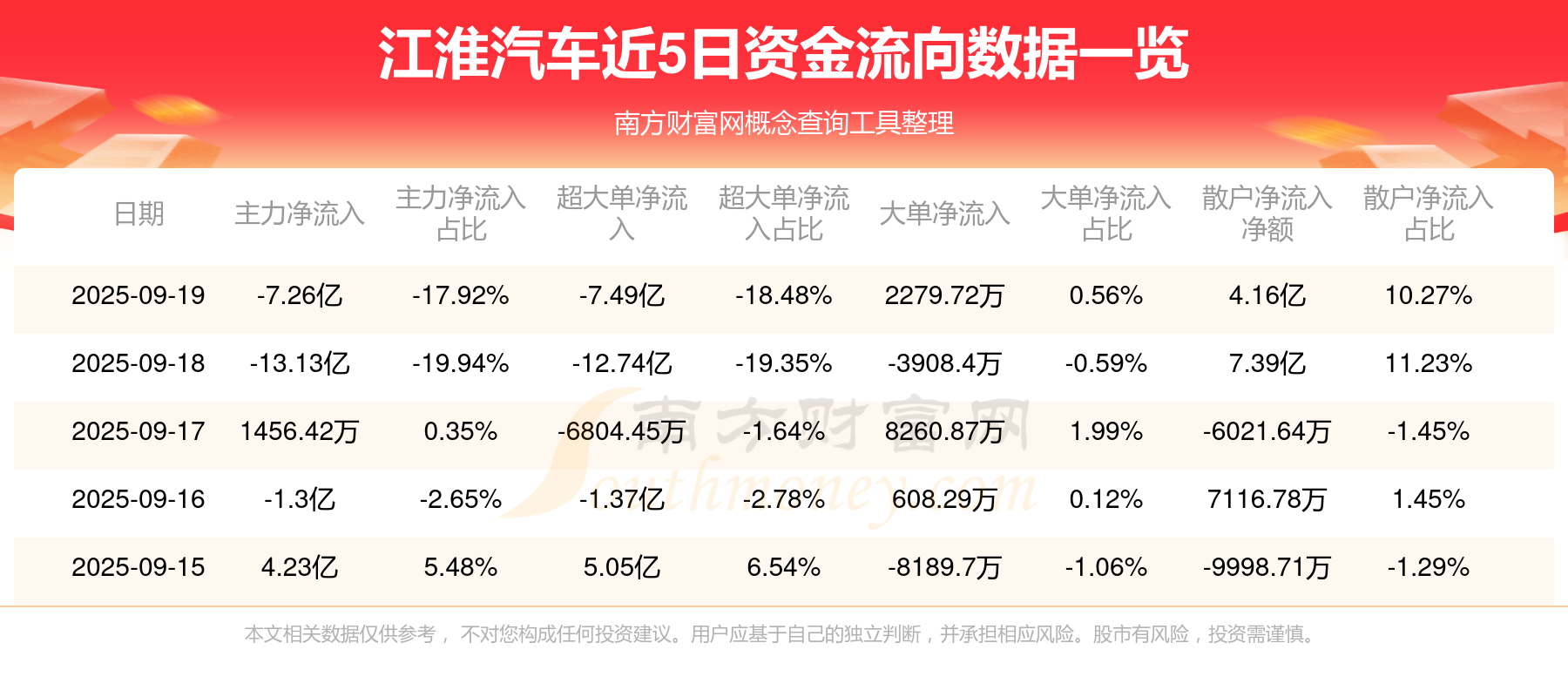 9月19日消息,江淮汽车主力资金净流出7.26亿元,超大单资金净流出7.49亿元,散户资金净流入4.16亿元。