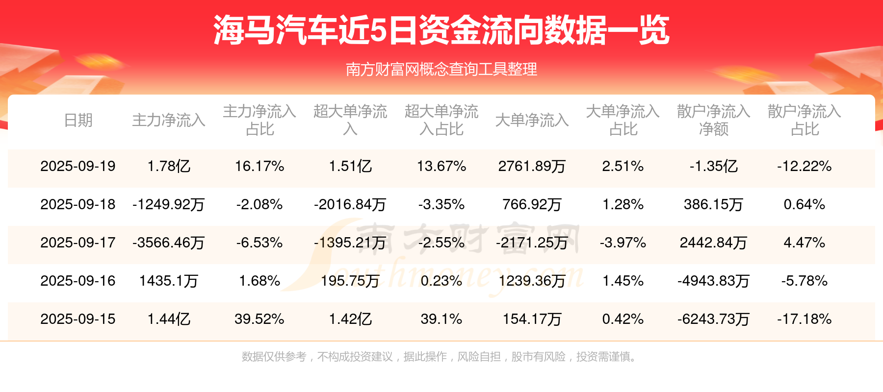 9月19日消息,海马汽车9月19日主力资金净流入1.78亿元,超大单资金净流入1.51亿元,大单资金净流入2761.89万元,散户资金净流出1.35亿元。