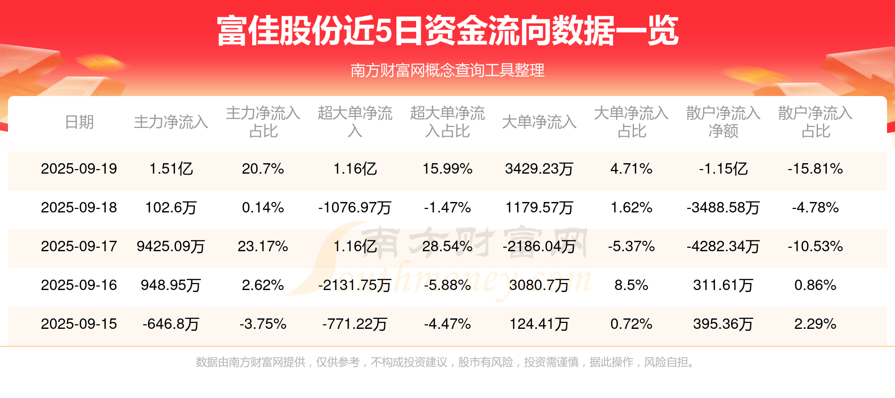 9月19日消息,富佳股份9月19日主力净流入1.51亿元,超大单净流入1.16亿元,大单净流入3429.23万元,散户净流出1.15亿元。