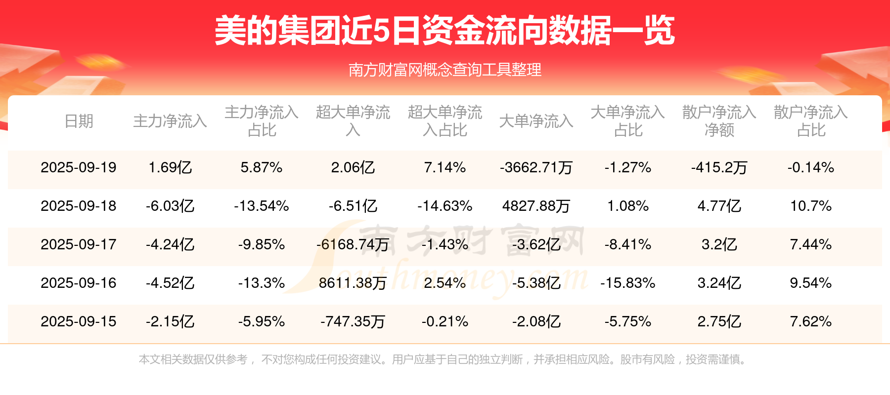 9月19日消息,美的集团9月19日主力净流入1.69亿元,超大单净流入2.06亿元,大单净流出3662.71万元,散户净流出415.2万元。