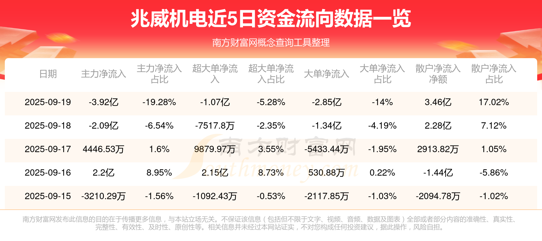 9月19日消息,兆威机电9月19日主力净流出3.92亿元,超大单净流出1.07亿元,大单净流出2.85亿元,散户净流入3.46亿元。