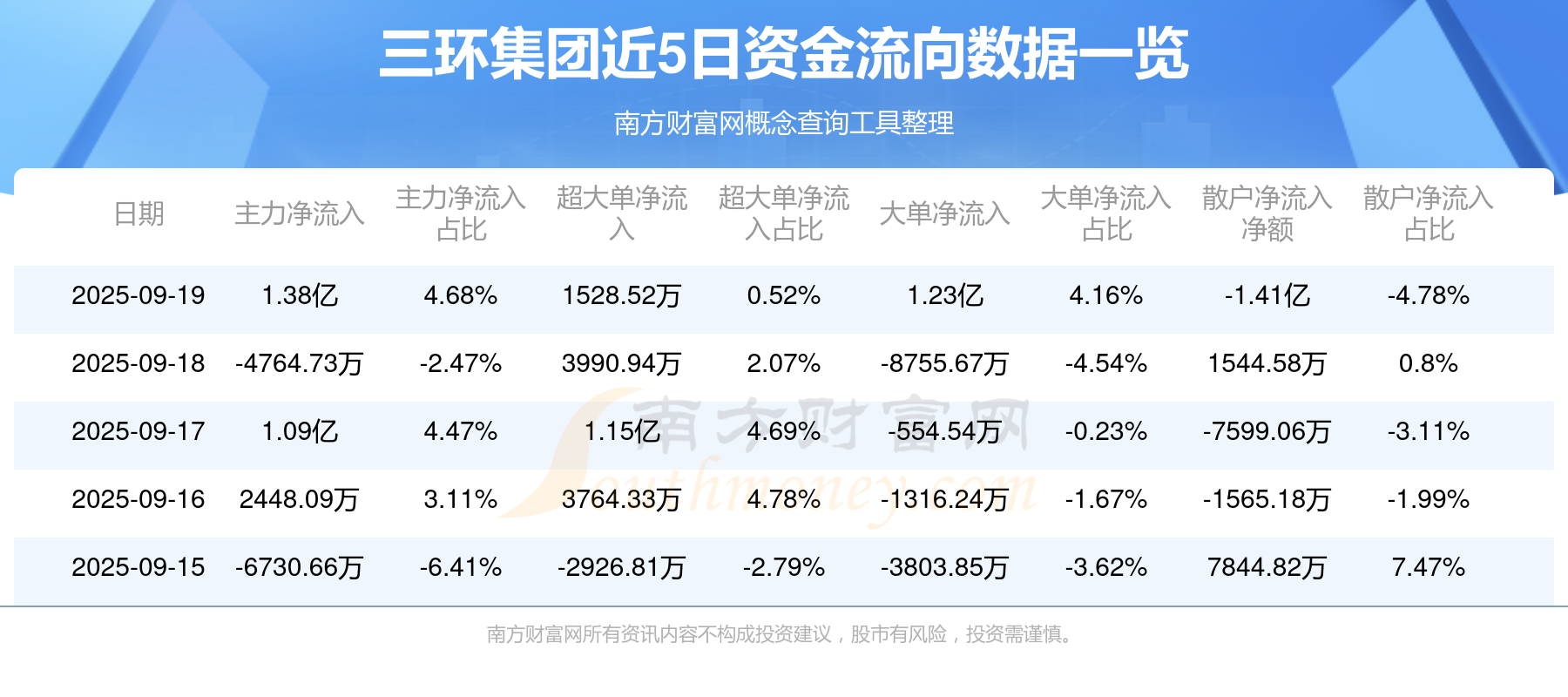 9月19日消息,三环集团9月19日主力净流入1.38亿元,超大单净流入1528.52万元,大单净流入1.23亿元,散户净流出1.41亿元。