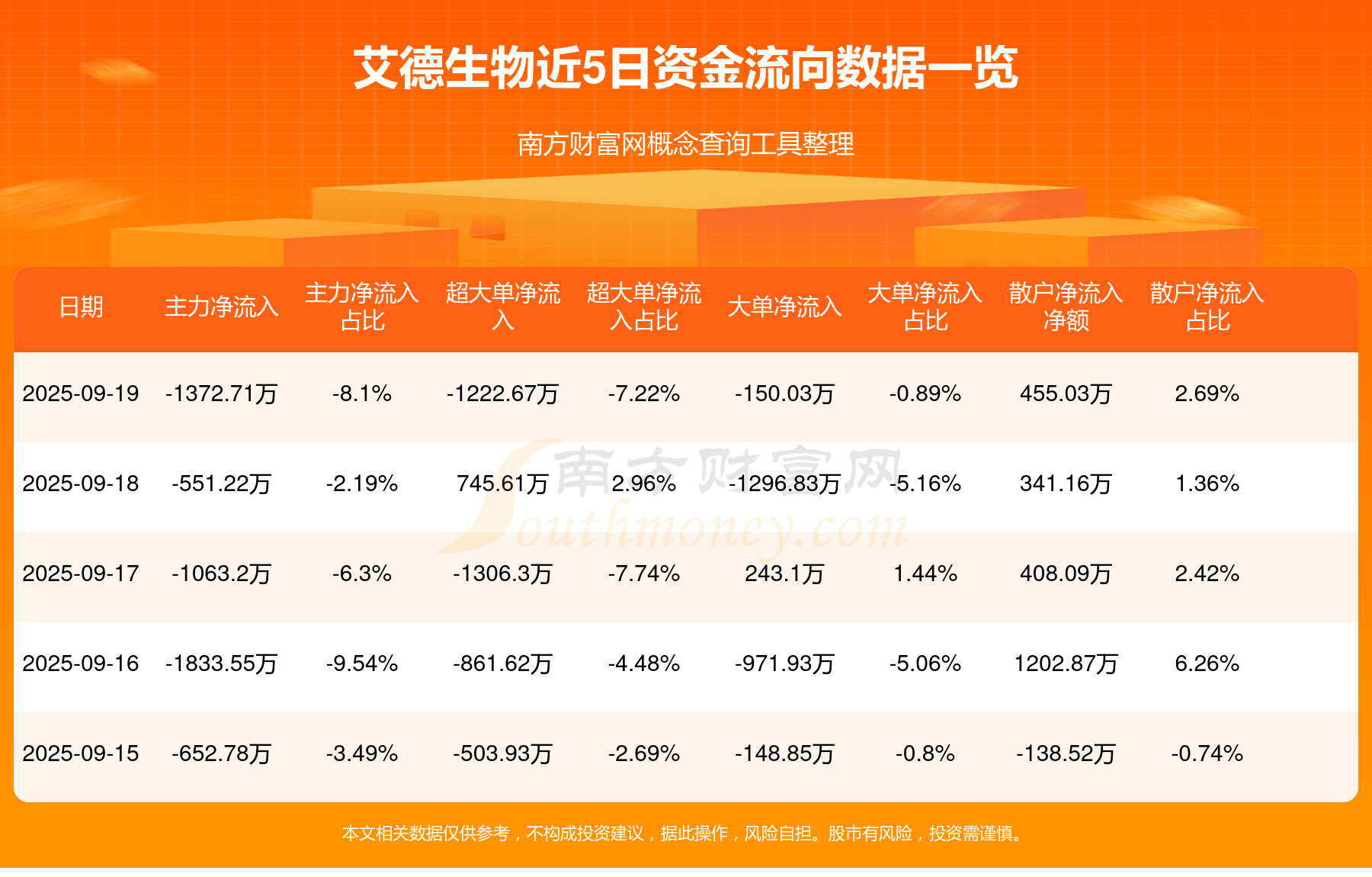 9月19日该股主力资金净流出1372.71万元,超大单资金净流出1222.67万元,大单资金净流出150.03万元,中单资金净流入917.68万元,散户资金净流入455.03万元。
