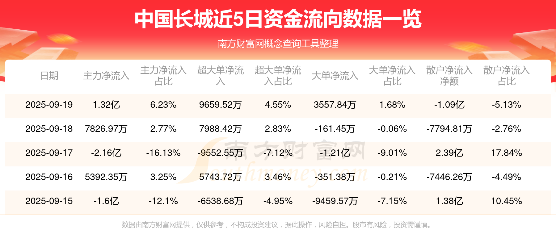 9月19日消息,中国长城主力资金净流入1.32亿元,超大单资金净流入9659.52万元,散户资金净流出1.09亿元。