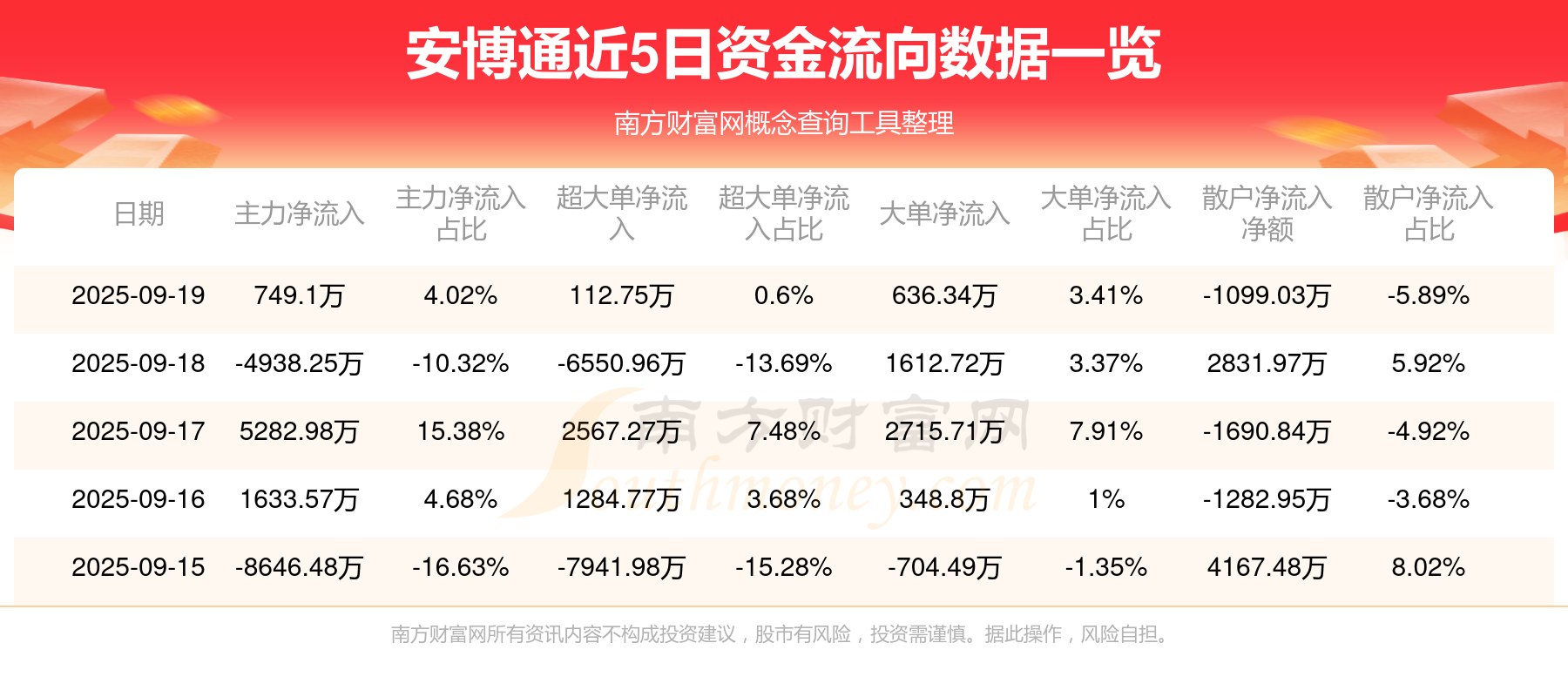 9月19日消息,安博通主力净流入749.1万元,超大单净流入112.75万元,散户净流出1099.03万元。