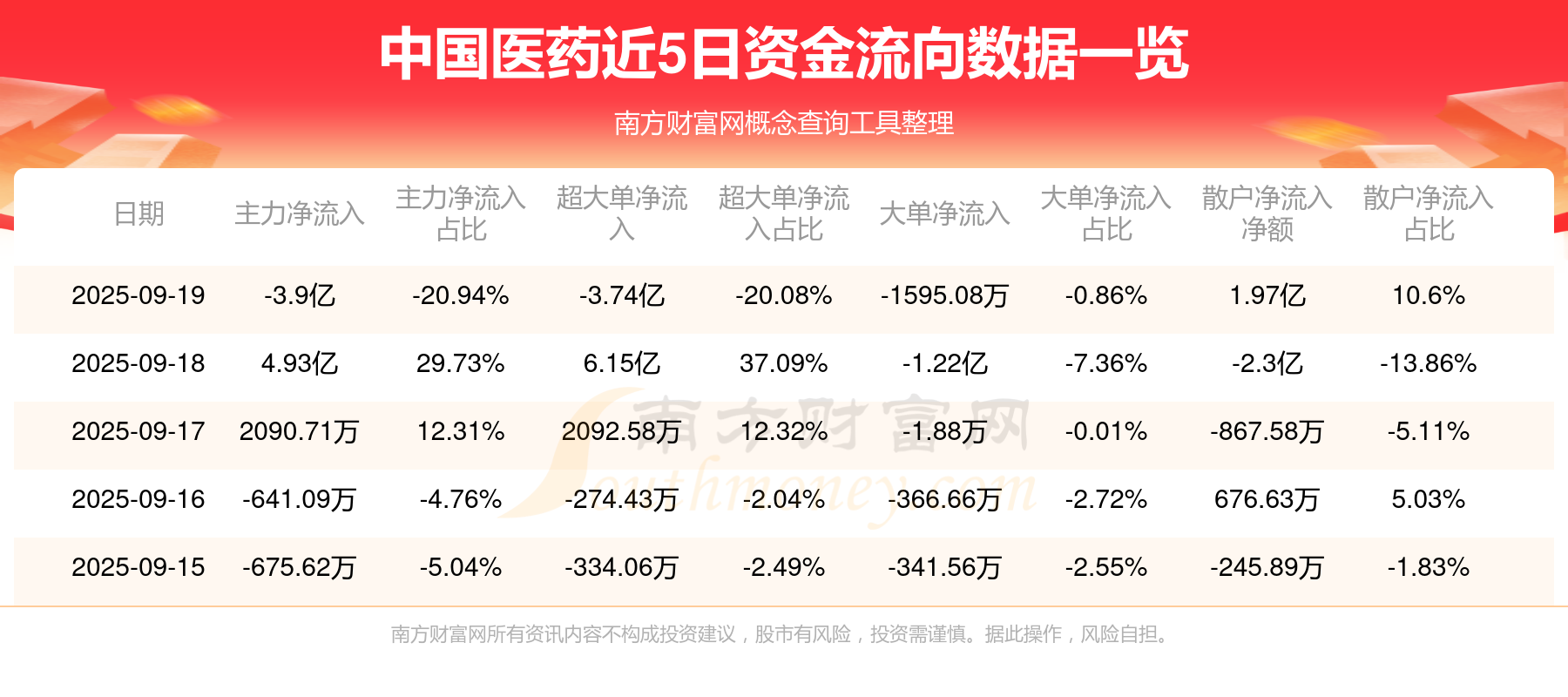 9月19日消息,中国医药主力净流出3.9亿元,超大单净流出3.74亿元,散户净流入1.97亿元。