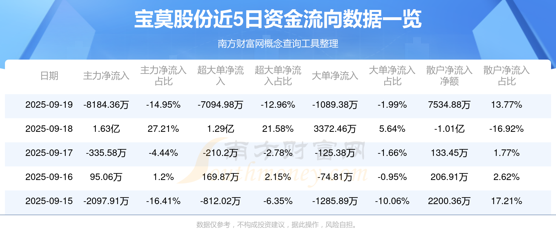 9月19日消息,宝莫股份资金净流出8184.36万元,超大单资金净流出7094.98万元,换手率15.17%,成交金额5.47亿元。
