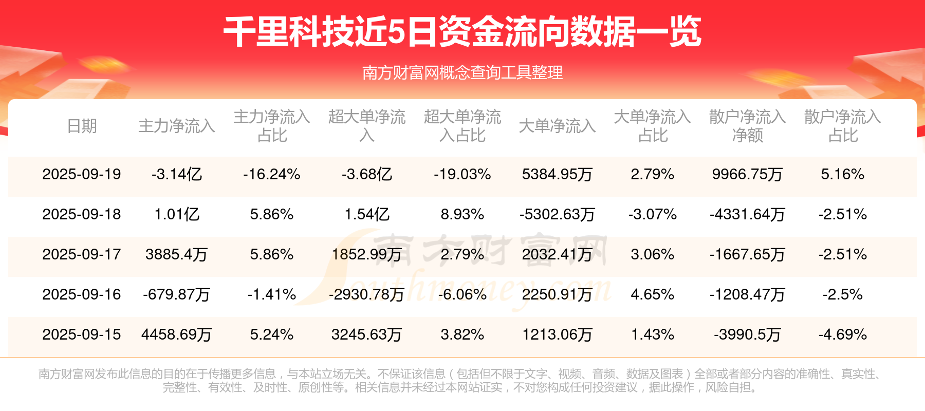 9月19日消息,千里科技资金净流出3.14亿元,超大单净流出3.68亿元,换手率3.6%,成交金额19.32亿元。
