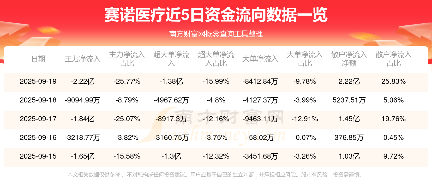 9月19日消息,赛诺医疗主力资金净流出2.22亿元,超大单资金净流出1.38亿元,散户资金净流入2.22亿元。