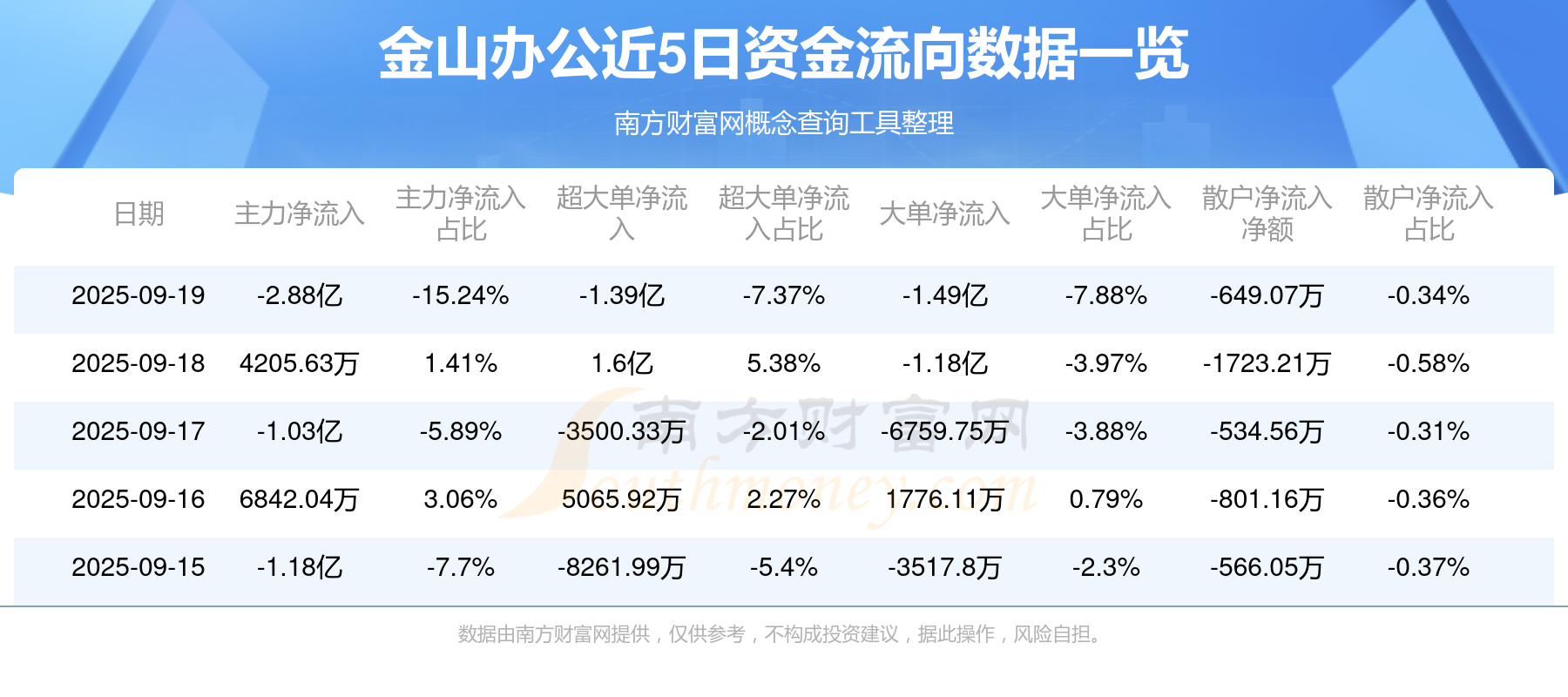 9月19日消息,金山办公主力净流出2.88亿元,超大单净流出1.39亿元,散户净流出649.07万元。