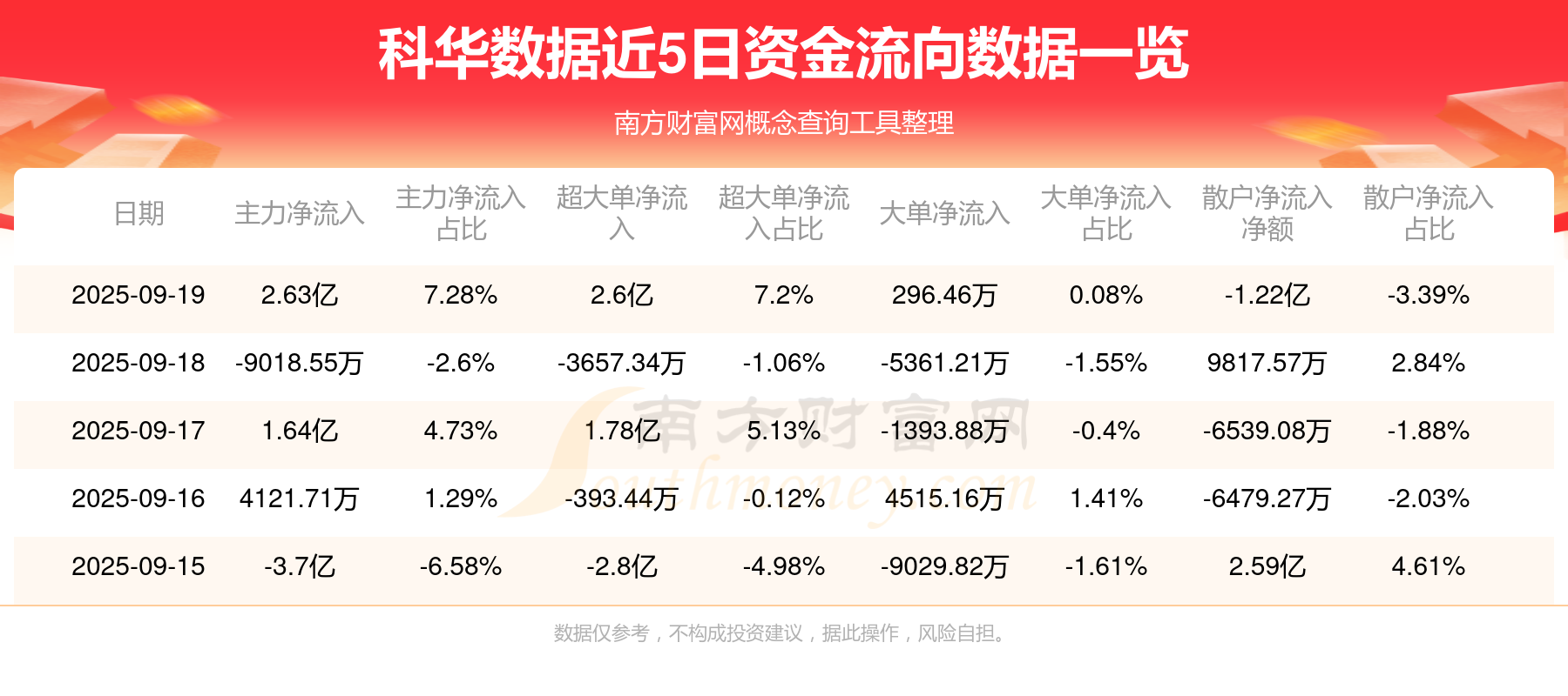 9月19日消息,科华数据9月19日主力净流入2.63亿元,超大单净流入2.6亿元,大单净流入296.46万元,散户净流出1.22亿元。
