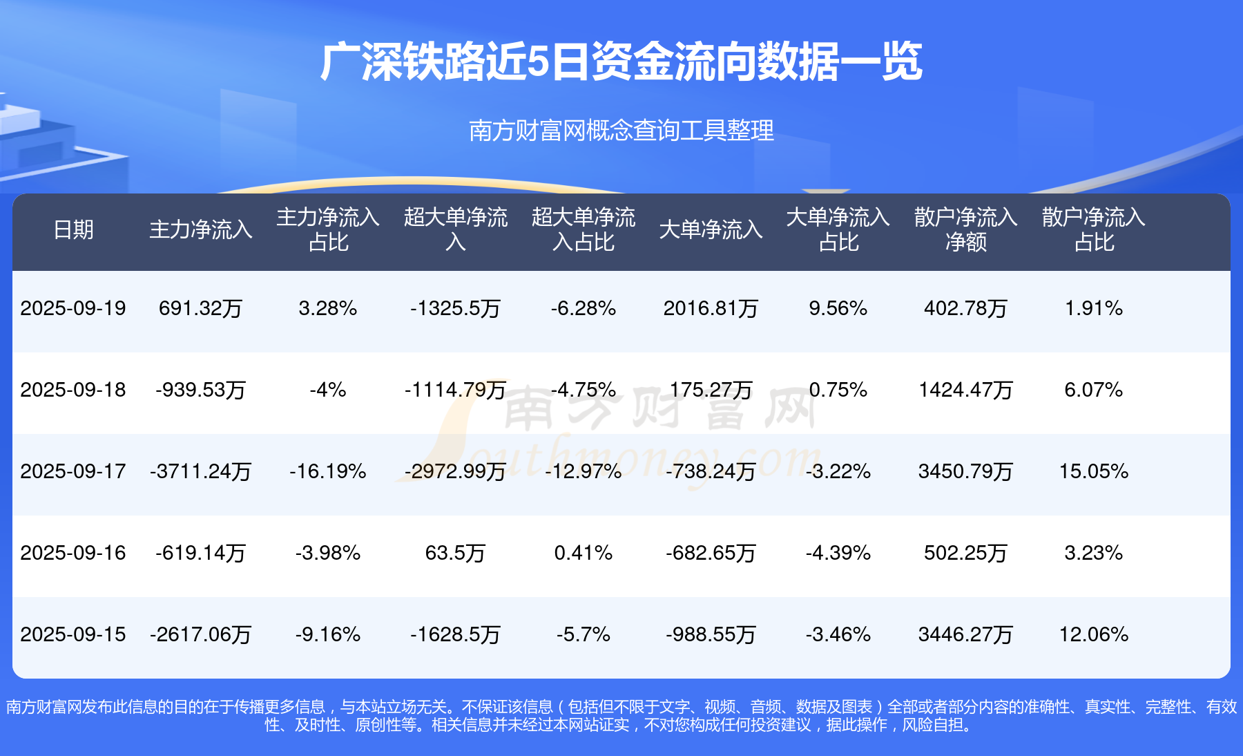 9月19日消息,广深铁路9月19日主力净流入691.32万元,超大单净流出1325.5万元,大单净流入2016.81万元,散户净流入402.78万元。