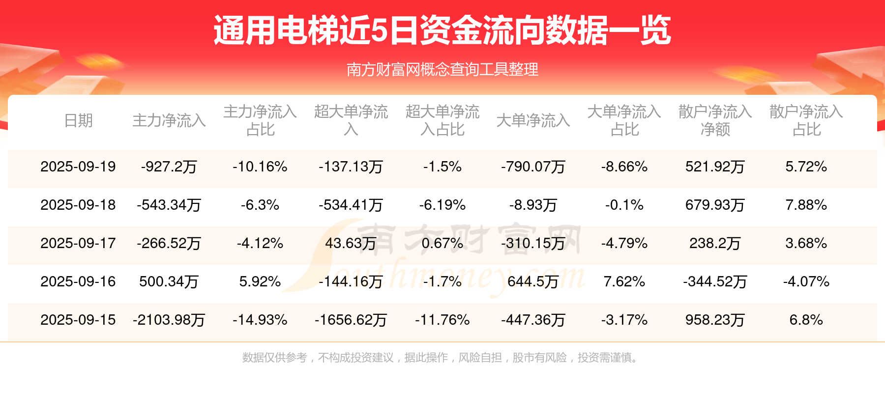 9月19日消息,通用电梯资金净流出927.2万元,超大单资金净流出137.13万元,换手率4.82%,成交金额9126.86万元。