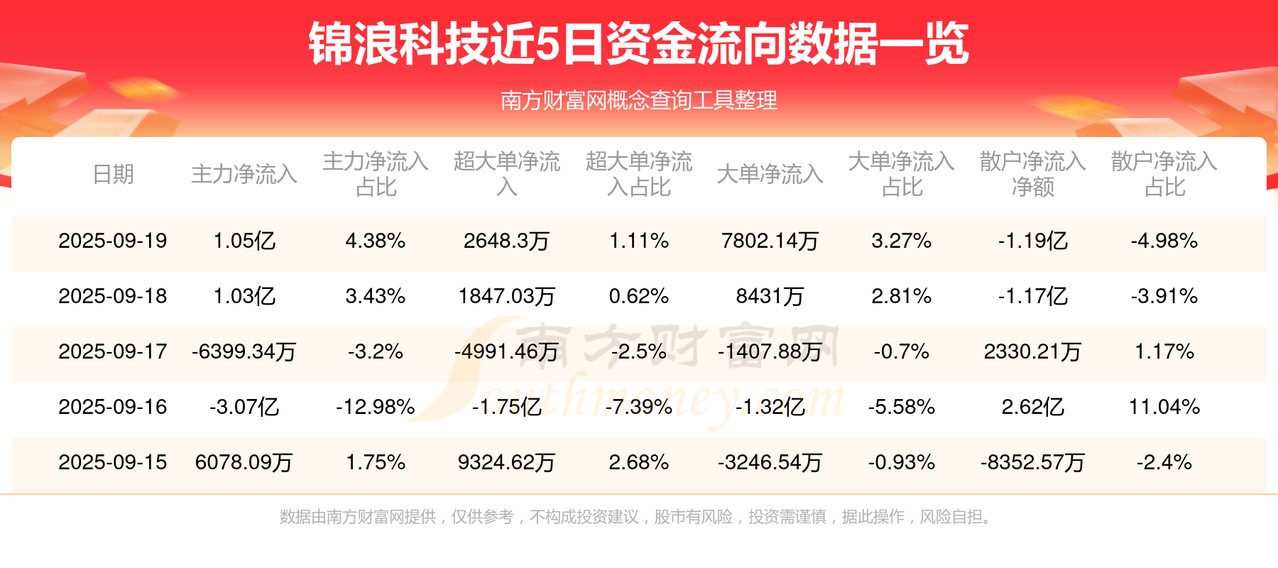 9月19日消息,锦浪科技主力净流入1.05亿元,超大单净流入2648.3万元,散户净流出1.19亿元。