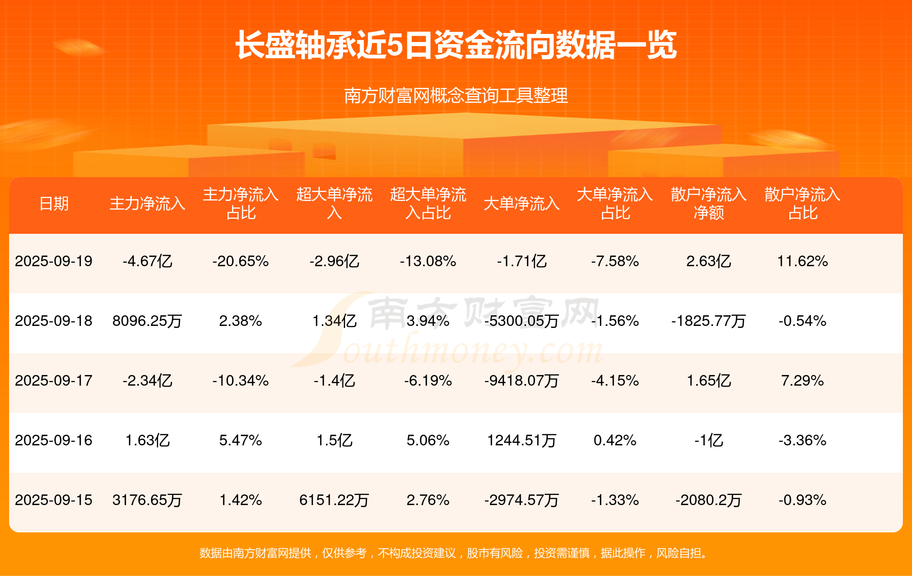9月19日消息,长盛轴承主力资金净流出4.67亿元,超大单资金净流出2.96亿元,散户资金净流入2.63亿元。