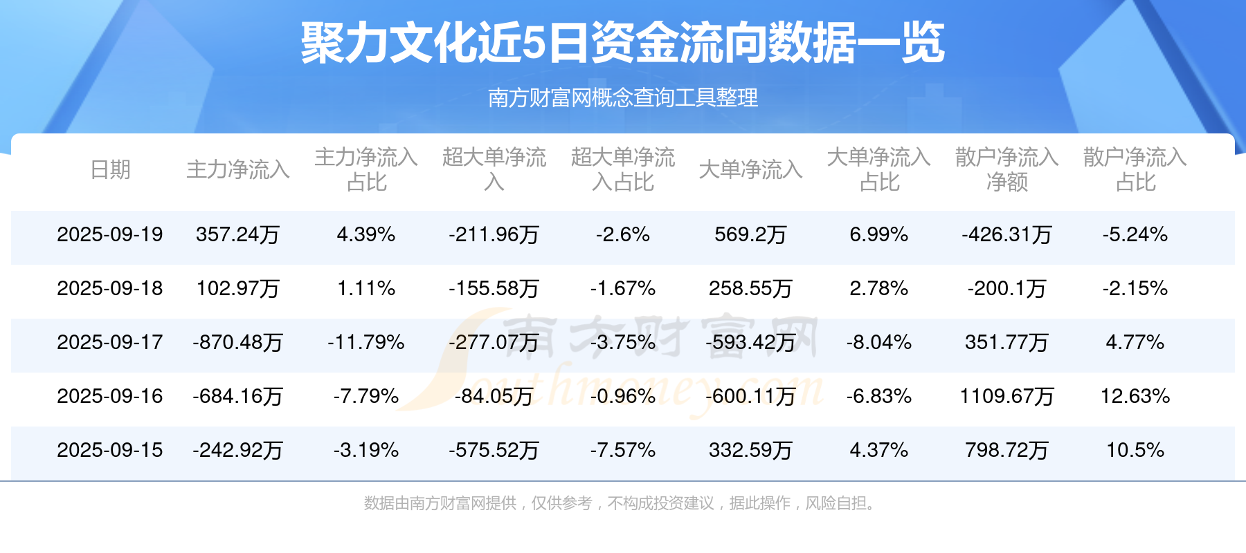 9月19日消息,聚力文化资金净流入357.24万元,超大单资金净流出211.96万元,换手率4.41%,成交金额8141.88万元。