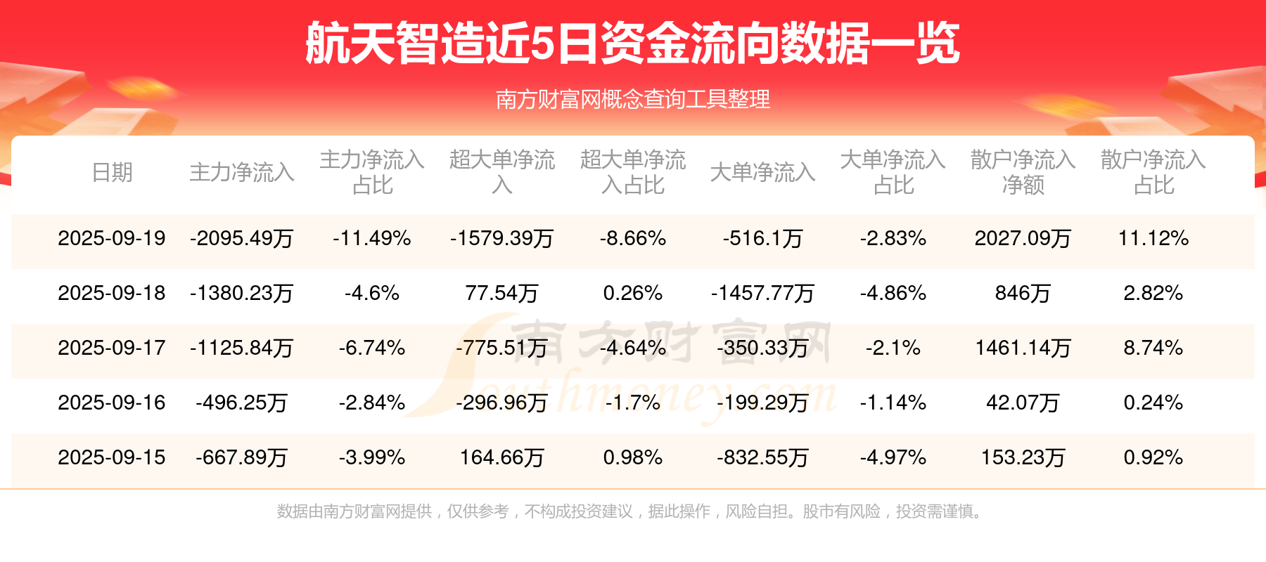 9月19日消息,航天智造9月19日主力资金净流出2095.49万元,超大单资金净流出1579.39万元,大单资金净流出516.1万元,散户资金净流入2027.09万元。