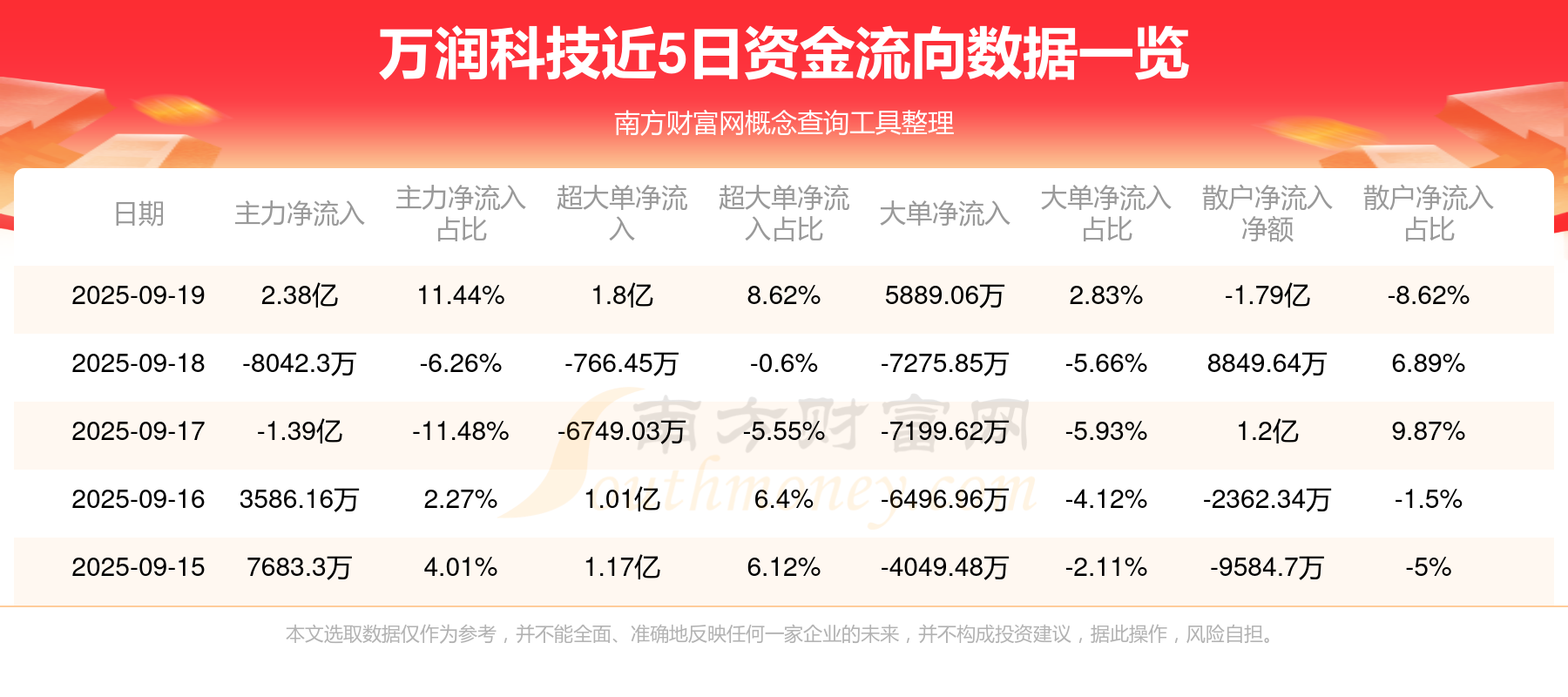 9月19日消息,万润科技9月19日主力资金净流入2.38亿元,超大单资金净流入1.8亿元,大单资金净流入5889.06万元,散户资金净流出1.79亿元。