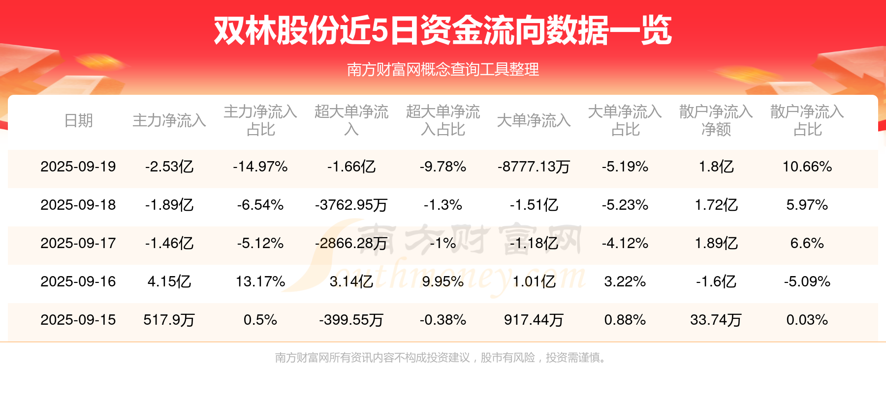 9月19日消息,双林股份主力资金净流出2.53亿元,超大单资金净流出1.66亿元,散户资金净流入1.8亿元。