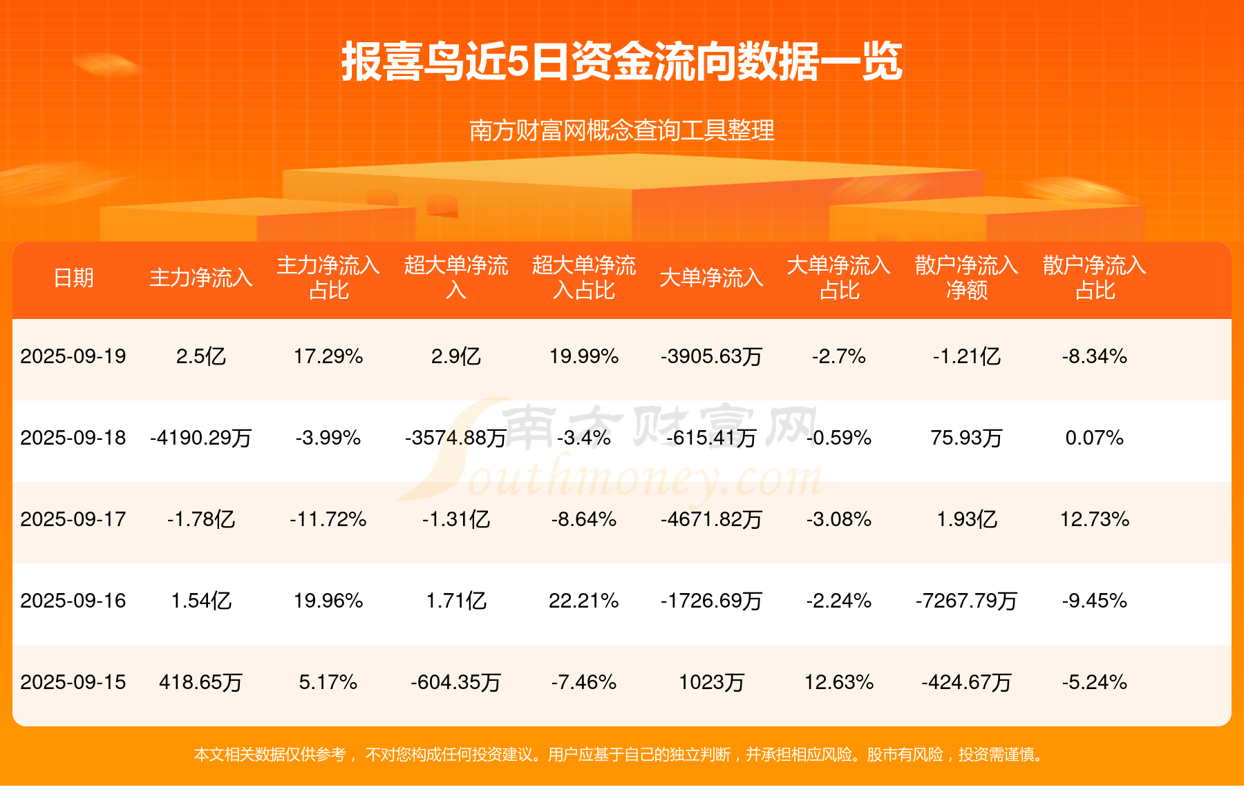 9月19日消息,报喜鸟9月19日主力资金净流入2.5亿元,超大单资金净流入2.9亿元,大单资金净流出3905.63万元,散户资金净流出1.21亿元。