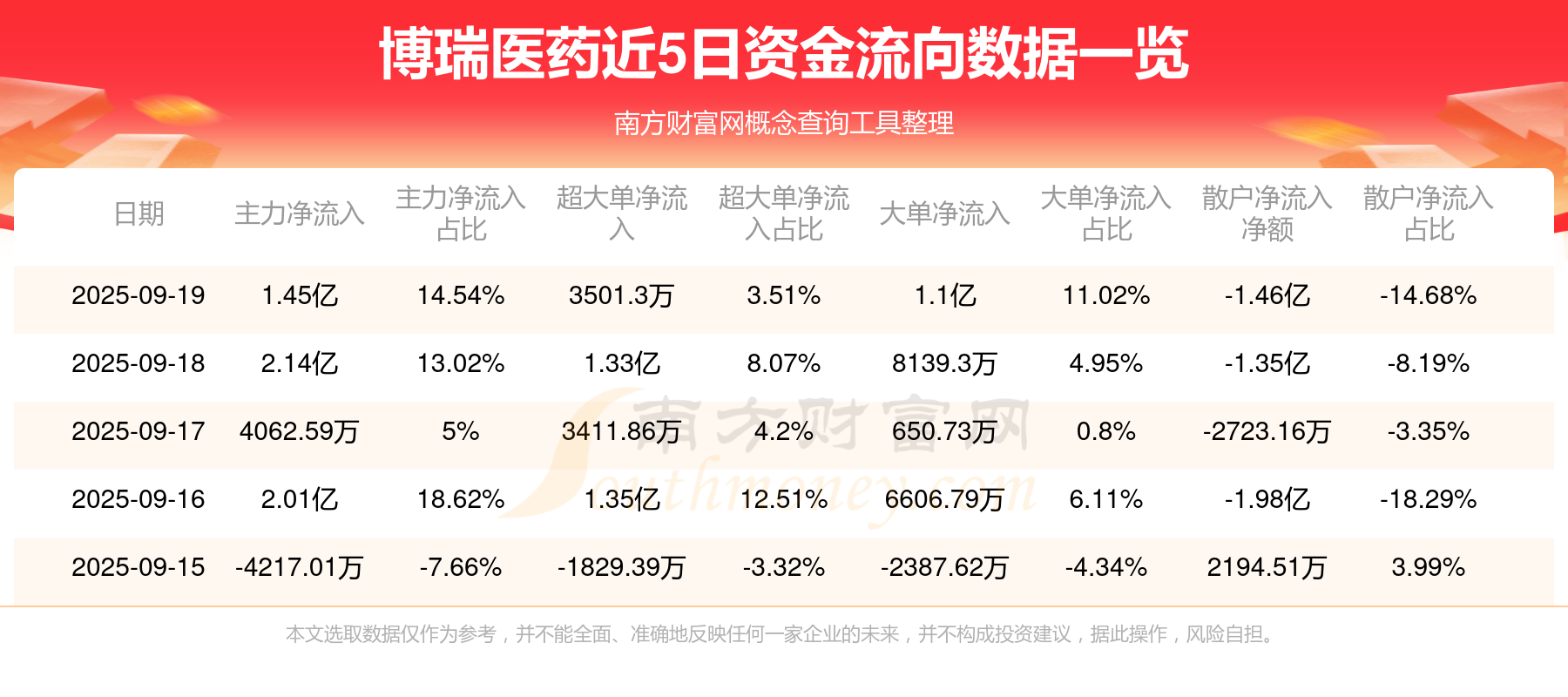 9月19日消息,博瑞医药主力资金净流入1.45亿元,超大单资金净流入3501.3万元,散户资金净流出1.46亿元。