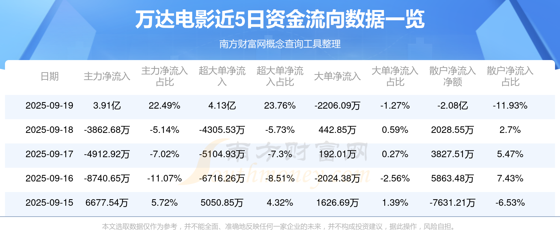 9月19日消息,万达电影主力资金净流入3.91亿元,超大单资金净流入4.13亿元,散户资金净流出2.08亿元。