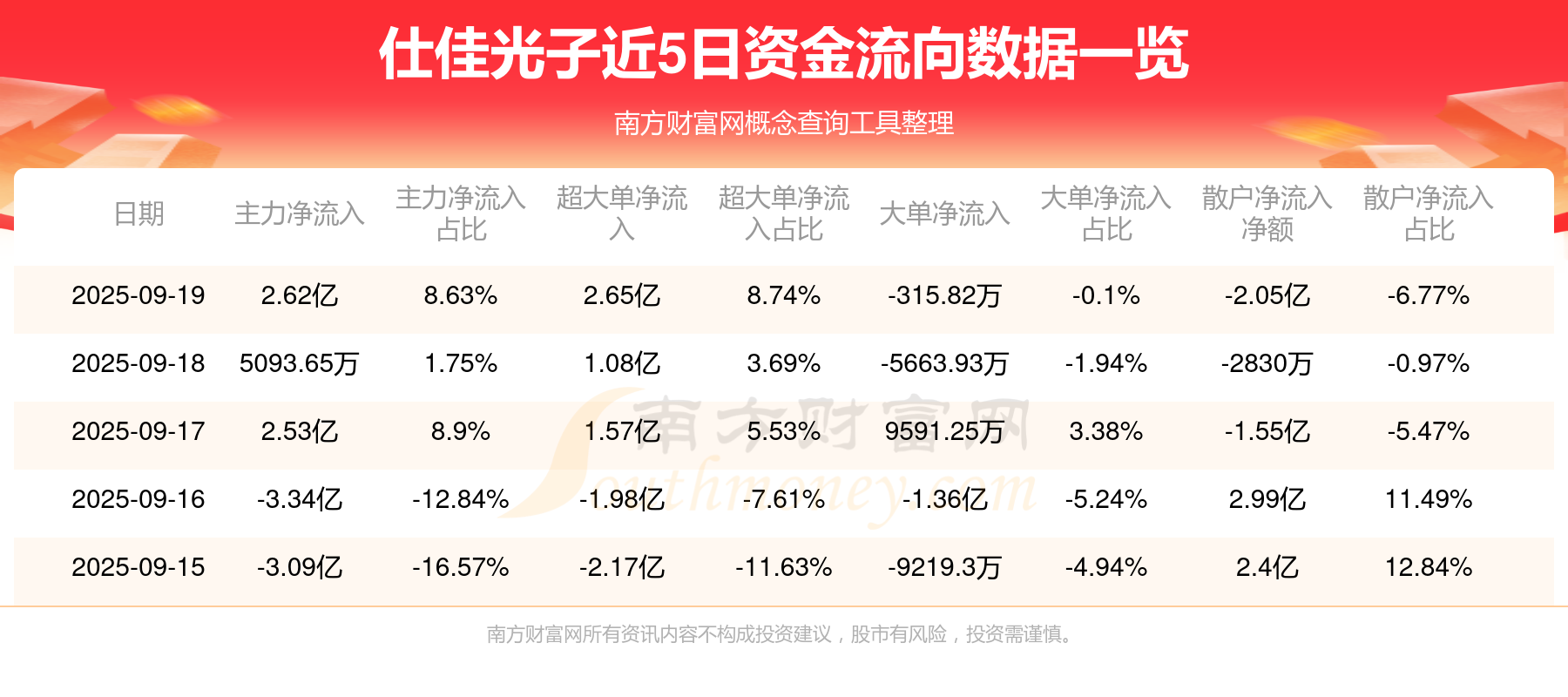 9月19日消息,仕佳光子资金净流入2.62亿元,超大单净流入2.65亿元,换手率8.7%,成交金额30.3亿元。