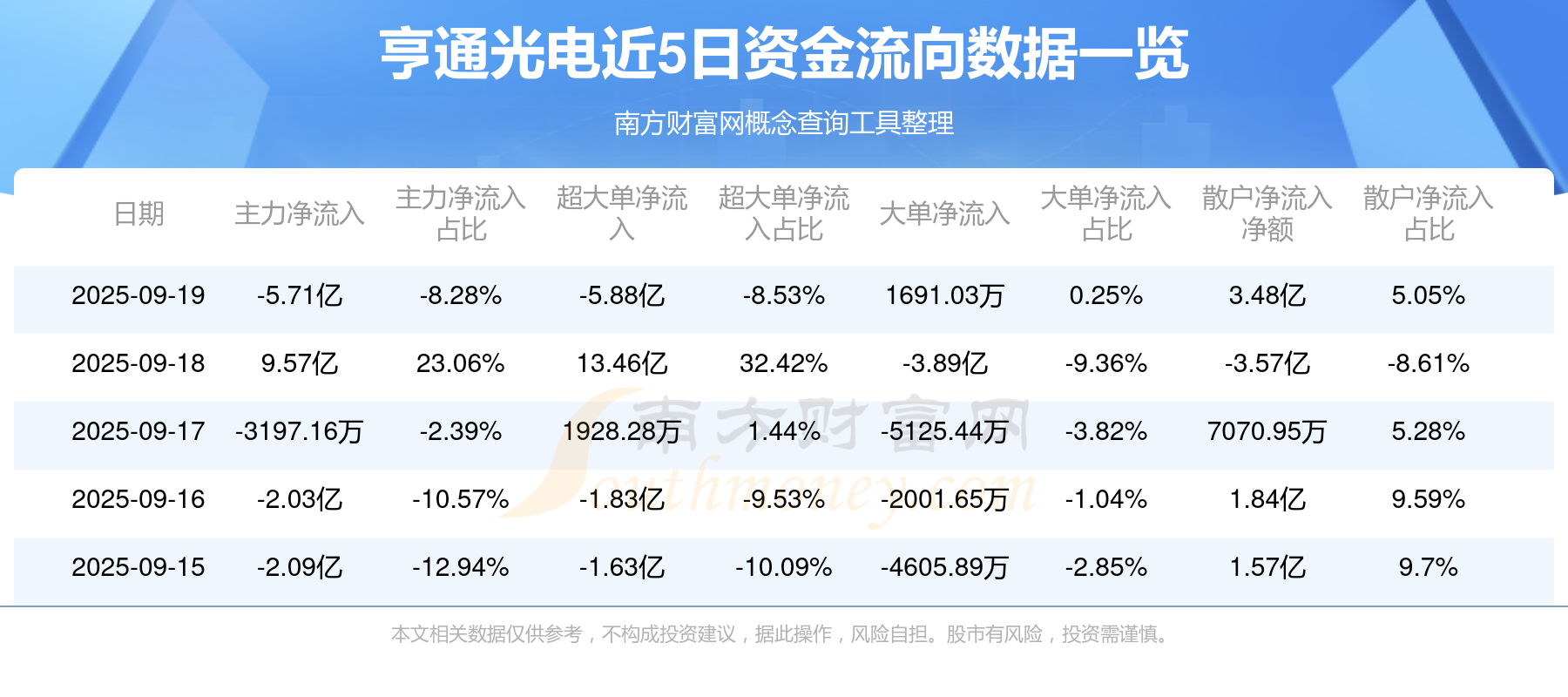 9月19日消息,亨通光电9月19日主力净流出5.71亿元,超大单净流出5.88亿元,大单净流入1691.03万元,散户净流入3.48亿元。