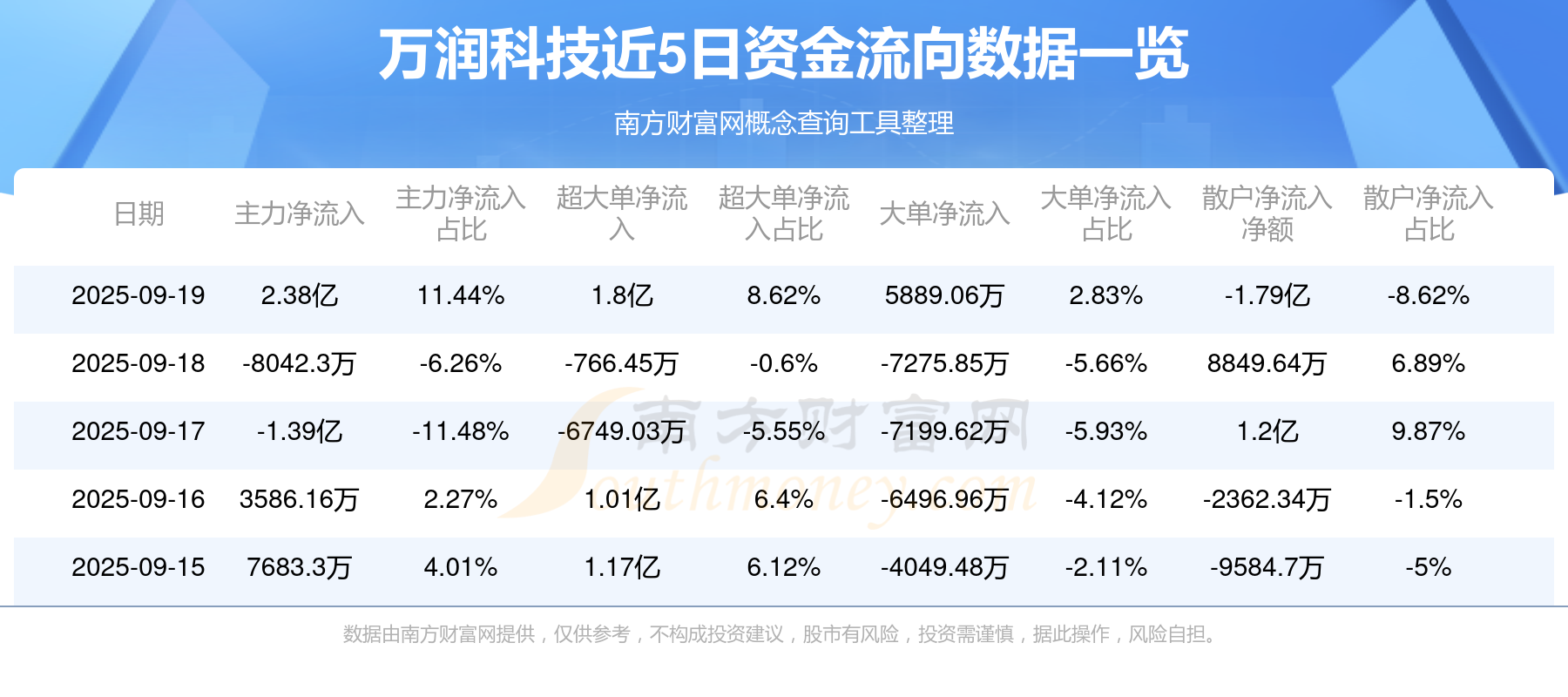 9月19日消息,万润科技资金净流入2.38亿元,超大单资金净流入1.8亿元,换手率17.09%,成交金额20.83亿元。