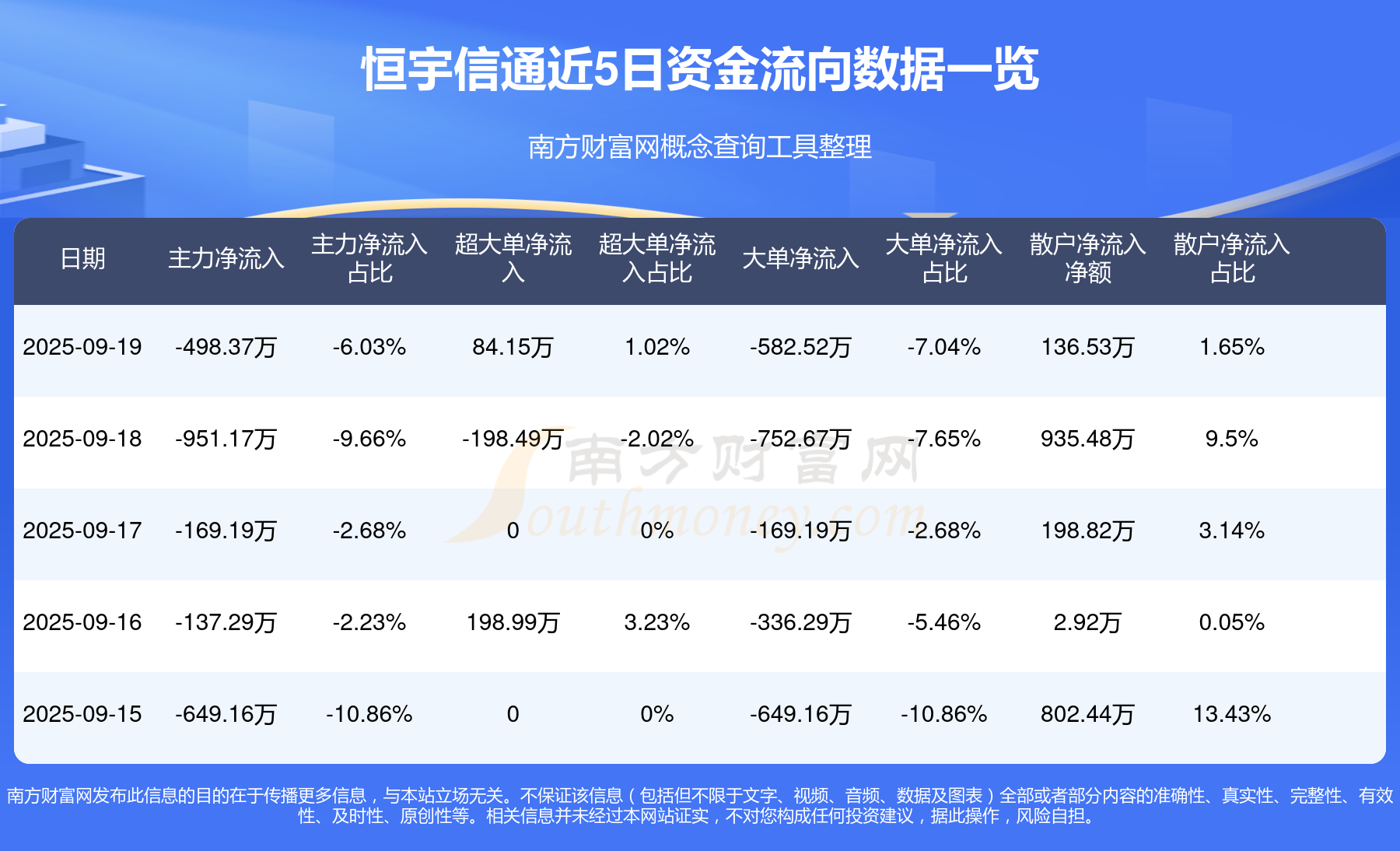 9月19日消息,恒宇信通资金净流出-498.37万元,超大单资金净流入84.15万元,最新报61.880元,换手率6.39%,成交总金额8271.05万元。