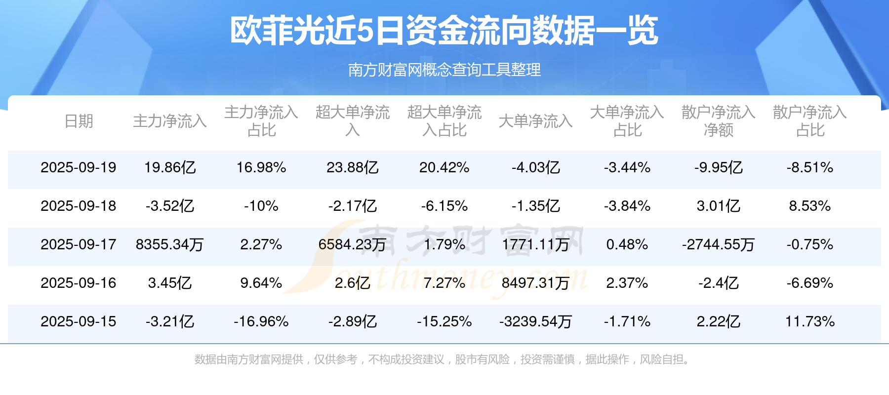 9月19日消息,欧菲光9月19日主力净流入19.86亿元,超大单净流入23.88亿元,大单净流出4.03亿元,散户净流出9.95亿元。