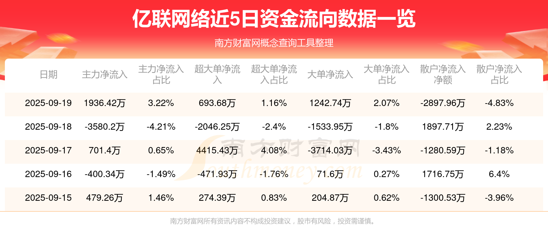 9月19日消息,亿联网络资金净流入1936.42万元,超大单资金净流入693.68万元,换手率2.09%,成交金额6.01亿元。